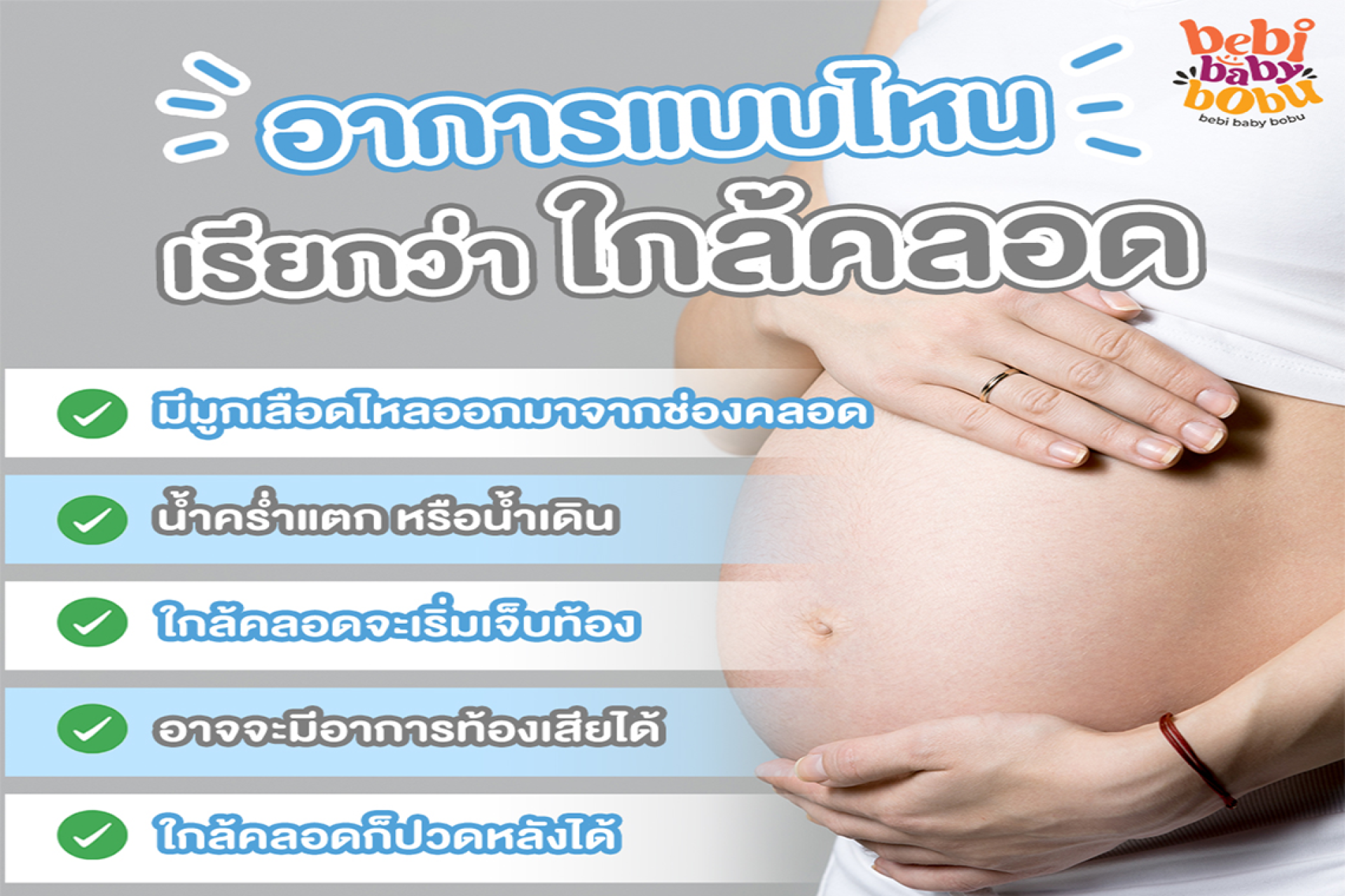 ตลอดระยะเวลา 9 เดือนที่คุณแม่อุ้มท้องก็เพื่อที่จะรอเวลาเจอหน้าเจ้าตัวเล็ก เพราะฉะนั้นอาการใกล้คลอดที่เป็นสัญญาณว่าเรากำลังจะได้กันแล้วนั้นจะมีอะไรบ้าง ทาง #Bebibabybobu มีมาบอกแล้วค่ะ เพื่อที่คุณแม่จะได้เตรียมความพร้อม ไม่ตื่นตระหนกจนเกินไปหากร่างกายแสดงอาการเหล่านี้ขึ้นนะคะ.