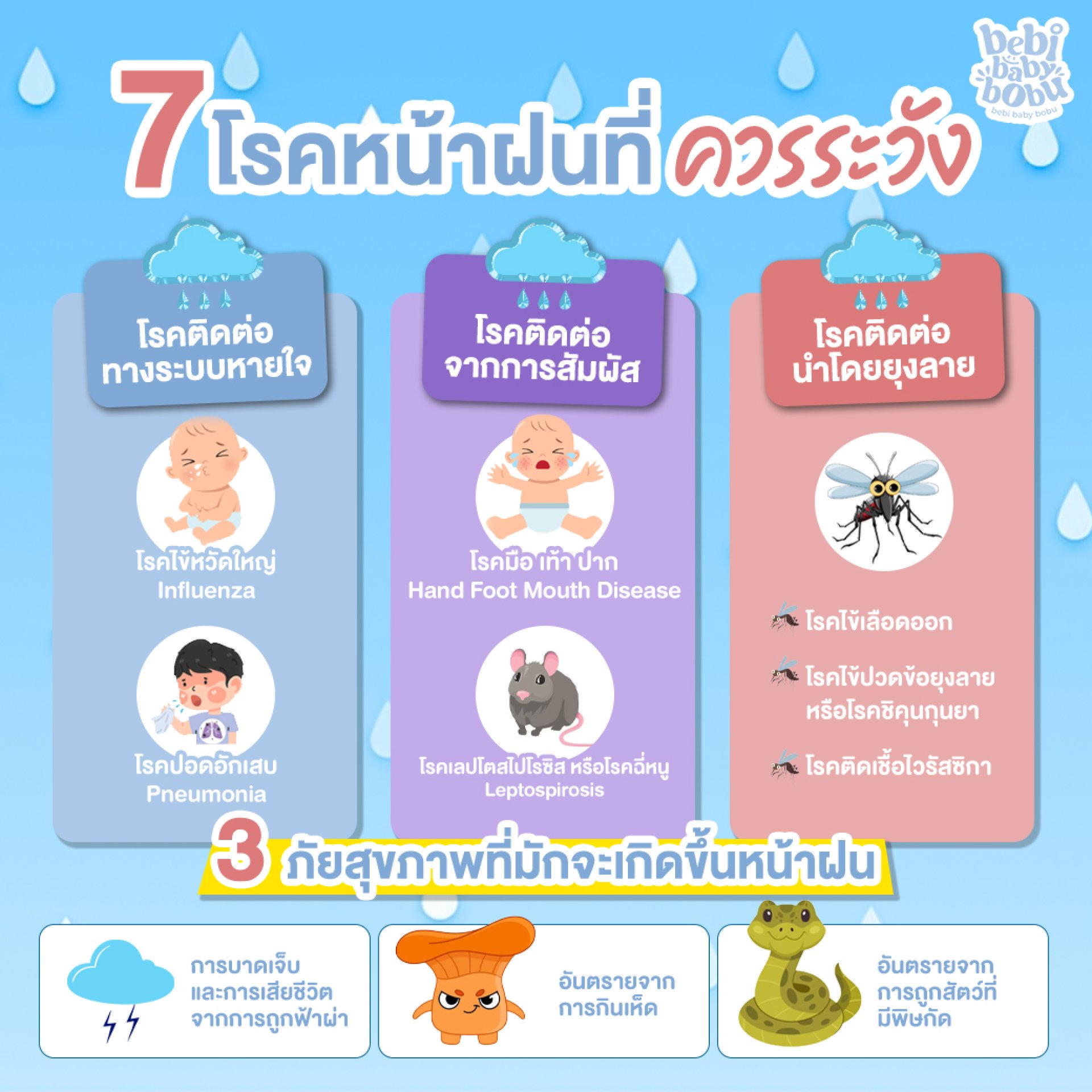 เข้าสู่ฤดูฝนก็เป็นอีกหนึ่งฤดูที่เต็มไปด้วยโรคภัยไข้เจ็บต่างๆ ที่มาพร้อมกับสภาพอากาศและความชื้นที่เปลี่ยนไป นำมาซึ่งเชื้อไวรัสและแบคทีเรียบางชนิดที่ทำให้เกิดโรค ซึ่งแม่ๆควรระมัดระวังและดูแลสุขภาพของตัวเองและลูกน้อยให้ห่างจากโรคดังกล่าว สำหรับโรคที่มักมากับหน้าฝน วันนี้เราก็ได้รวบรวมมาให้แล้วเช่นกัน